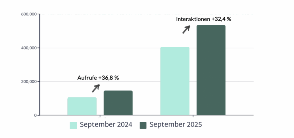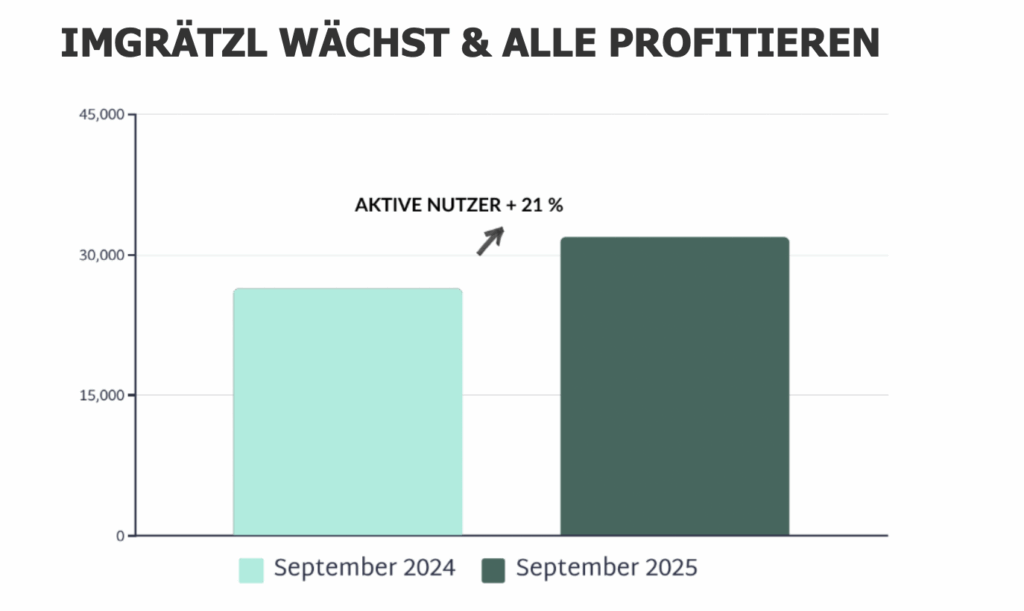 Für imGrätzl haben wir die Nutzungszahlen von September 2024 mit denen im September 2025 verglichen: Aktive User auf imGrätzl (30 Tage) -> setzt sich zusammen aus Besucher*innen und registrierten Nutzer*innen 2024: 26.418 2025: 31.957 Aufrufe imGrätzl (30 Tage) 2024: 106.473 2025: 145.701 Interaktionen mit imGrätzl (30 Tage) 2024: 403.762 2025: 534.751 Außerdem: Über 15.000 lokale Macher*innen haben den imGrätzl Newsletter abonniert. Je stärker sich imGrätzl verbreitet, desto mehr habt ihr davon, weil eure Inhalte dann natürlich auch automatisch mehr Menschen erreichen. Noch eine kleine Zusatzinfo. Allein im September wurden eure imGrätzl Inhalte über 500.000 Mal in den Google-Suchergebnissen angezeigt. Sehr cool! Wir arbeiten natürlich weiter dran eure Inhalte ganz oben zu platzieren! |